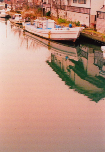 港町の川は、小型船の停泊場になっています。